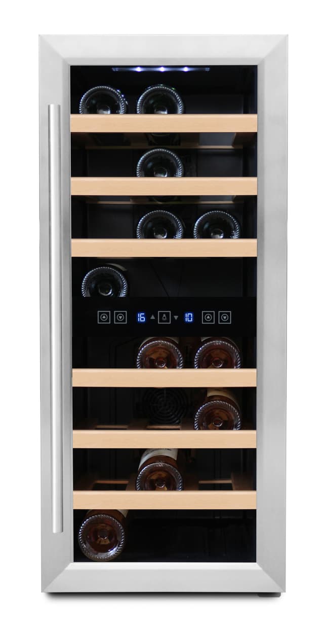 Tyylipuhdas ja hiljainen vapaasti seisova viinikaappi, jossa on tilaa 24 pullolle, ja joka on jaettu kahteen säädettävään lämpötila-alueeseen. Ihanteellinen sinulle, jos haluat viilentää sekä puna- että valkoviiniä samanaikaisesti! Muotoiltu ruostumattomasta teräksestä tyylikkäillä yksityiskohdilla, kosketus näytöllä, led-valaistuksella ja ulosvedettävillä puuhyllyillä.