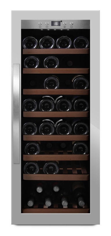 mQuvée - WineExpert 43 Stainless - Vapaasti seisova viinikaappi Vapaasti seisova viinikaappi, joka on nimensä arvoinen! WineExpert 43:lla saat tuntea laadun. Ulosvedettävät, kiskoilla varustetut puuhyllyt varmistavat vakauden ja ne vedetään ulos pehmeällä liikkeellä. Viinikaapin toimintoja ohjataan omilla painikkeilla, ja asetukset näkyvät digitaalisella näytöllä. Viinikaappi on suunniteltu sopimaan kaikentyyppisille pulloille, joten siinä on tilaa myös kuohuviinille.