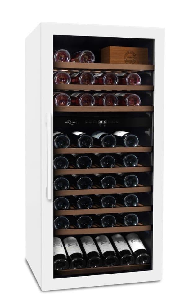 Suuri ja tyylipuhdas, vapaasti seisova viinikaappi mattavalkoista viimeistelyä kahdella lämpötilavyöhykkeellä merkiltä mQuvée. Tässä viinikaapissa on esittelyhylly, jonka ansiosta voit laittaa parhaat viinisi elegantisti näytteille. Viinikaapissa on myös tehokas aktiivihiilisuodatin, joka varmistaa, että paha haju pysyy loitolla viinipulloistasi. Viinikaapissa on tilaa 70 pullolle ja sen energialuokka on G.