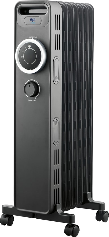 Apt-öljypatteri tarjoaa tasaista, hiljaista lämpöä viidellä rivalla. Siinä on kolme lämpötila-asetusta, säädettävä termostaatti, kaatumis- ja ylikuumenemissuoja sekä johdon säilytyspaikka turvalliseen ja käytännölliseen käyttöön.Tutustu ominaisuuksiin
