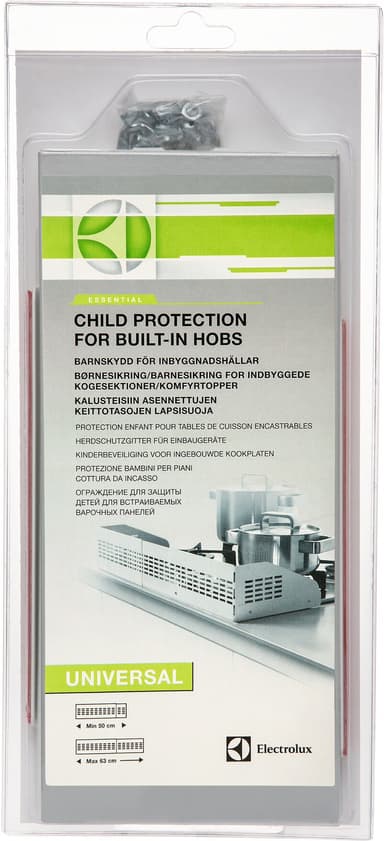 Electrolux turvasuoja lapsille integroitaviin keittotasoihin. Leveys: min 50 cm, max 63 cm. Yleissopiva, helppo asentaa, suojaa palovammoilta. Sisältää 1 kpl.Tutustu ominaisuuksiin