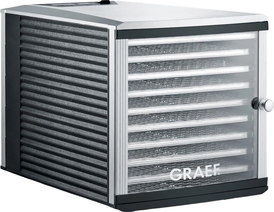 630 W Graef-ruoankuivaimessa on 10 lokeroa, joiden kokonaispinta-ala on 1,08 m². Se on ihanteellinen hedelmien ja sienten kuivaamiseen ja niiden muuttamiseen terveellisiksi välipaloiksi. Siinä on 30-70 °C säädettävä lämpötila sekä kätevä ajastin.Tutustu ominaisuuksiin