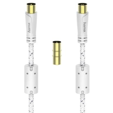 Hama-antennikaapeli takaa häiriöttömän äänen ja videon siirron. Valkoisessa 120 dB kaapelissa on kullatut 24 K liittimet, jotka takaavat sen, etteivät elektromagneettiset häiriöt vaikuta signaalin laatuun. Kestävässä ja joustavassa kaapelissa on irrotettava ferriittiydin, joka helpottaa kiinnittämistä.