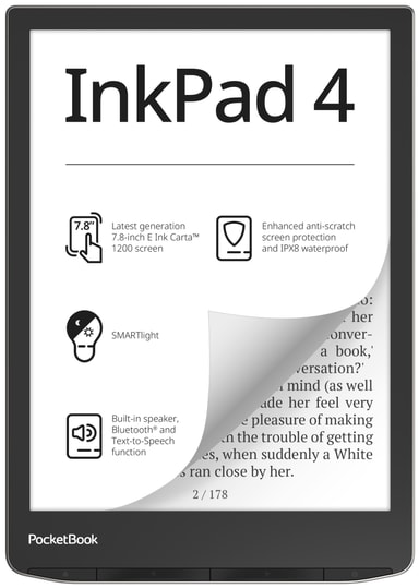 Lue suosikkikirjasi tyylikkäällä 32 GB PocketBook InkPad 4 -lukulaitteella, jossa on 7,8" E-ink Carta 1200 HD+ -näyttö, sisäänrakennettu kaiutin, Bluetooth-yhteys tekstistä puheeksi -toimintoa varten ja jopa kuukauden akunkesto.Tutustu ominaisuuksiin