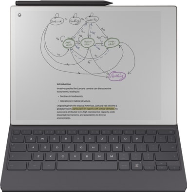 Kun avaat näppäimistön, näyttö kääntyy automaattisesti, joten voit vaihtaa vapaalla kädellä kirjoittamisen ja kirjoittamisen välillä. Kommentit liitetään älykkäästi kirjoitettuun tekstiin, kun siirrät sitä ylös ja alas sivulla. Kirjoittaminen on aina helppoa ilman latausta, pariliitosta tai kaapeleita.