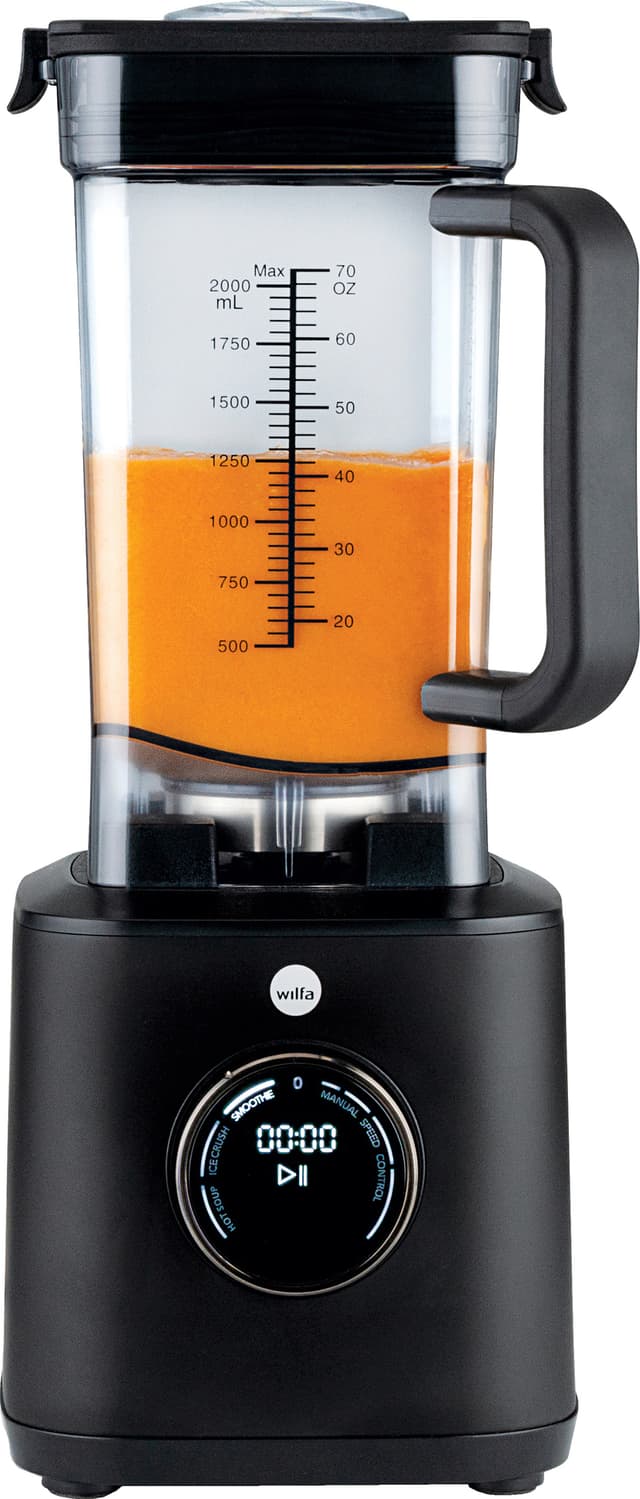Wilfa Powerfuel XL -tehosekoittimessa on voimakas 2000 W moottori, jota voi käyttää yhteen menoon jopa 10 minuuttia ilman ylikuumenemista. 2-litrainen Tritan-kannu on kevyt ja kestää jopa 100 asteen lämpötilaa, joten sitä voi käyttää myös lämpimien ruokien, kuten sosekeittojen, valmistukseen.