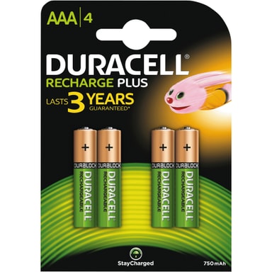 Uudelleenladattava ja käytössä kestävä Duracell Recharge Plus AAA-paristo. Korkeatehoinen 750 mAh paristo kestää jopa 300 latauskertaa. Paristo sopii paljon virtaa vaativiin tai usein käytettäviin laitteisiin, kuten tietokoneen hiiri, kaukosäädin, peliohjain tai vauvan itkuhälytin.