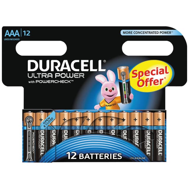 Duracell Ultra Power AAA -alkaliparistot, 12 pariston pakkaus. Laadukkaissa Duracell -paristoissa on luotettava ja pitkä säilyvyys ja käyttöaika jopa alhaisissa lämpötiloissa. Duralock Power -tekniikan ansiosta paristot säilyvät varastoituna jopa 10 vuoden ajan. Paristot sopivat käytettäväksi pienissä elektroniikkalaitteissa, kuten käsikonsoli, parranajokone, kaukosäädin, CD-soitin, lelut ja taskulamput.