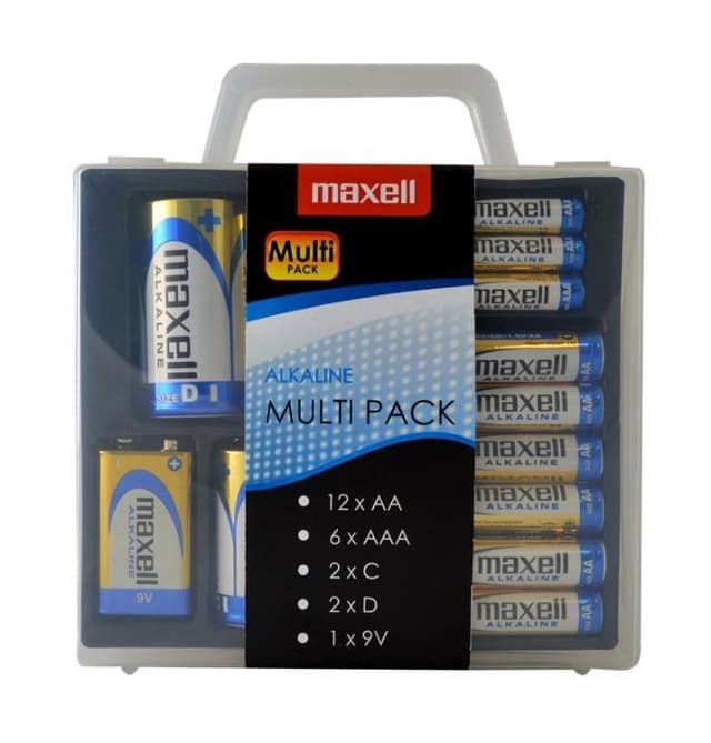 Maxell Alkaline Battery Multi-Pack, AA/AAA/C/D/9V, protective tray, black