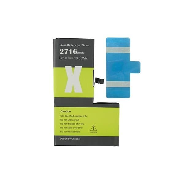 Ensiluokkainen akku ja akun tarra iPhone X mallille. Korkealaatuinen litiumioni vaihtoakku. Erittely Matkapuhelimen akku: Li-ioni - 3.81V - 10.35Wh Kapasiteetti: 2716 mAh Yhteensopivuus: iPhone X Tuotemerkki: Oh-Box