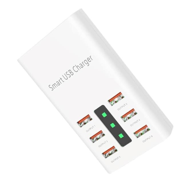 Latausasema, jossa on 6 USB-porttia, joiden avulla voit ladata useita eri laitteita samanaikaisesti. Se on varustettu sisäänrakennetulla turvasuojuksella, joka estää oikosulut ja ylikuumenemisen. Siinä on myös vahvistettu kuparijohto, joka pitää voimansiirron vakaana koko ajan, ja laitteessa on 1,5 metrin pitkä johto, joka voidaan irrottaa.