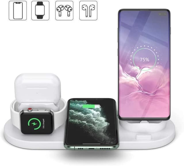 Monitoiminen laturi Qi-yhteensopiville laitteillesi, kuten iPhone ja Apple Watch. Nopeaan lataamiseen suositellaan 9 V / 2 A: n virtalähdettä, joka tukee 9 W: n virtaa (ei sisälly pakkaukseen). Se voi ladata jopa 6 laitetta samanaikaisesti ja sillä on 2 langatonta latauspintaa, 1 mikro-USB, 1 USB-C ja 2 latausporttia Apple-tuotteille (iPhone, iPad, AirPods).