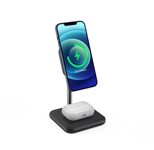 Tämä Magsafe-latausasema on kätevä ratkaisu iPhonen ja Airpodin lataamiseen samanaikaisesti. Sisäänrakennettu Magsafe-toiminto varmistaa, että matkapuhelimesi päätyy aina oikein latauspinnalle. Lataustelineen ergonominen kulma ja se voi ladata puhelimesi missä tahansa suunnassa.