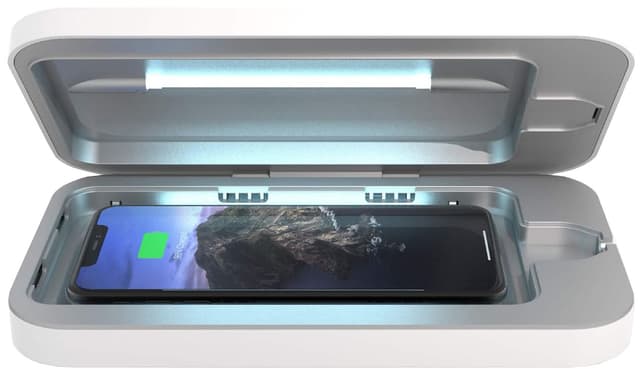 PhoneSoap Wireless -desinfiointilaite, jossa on 2 UV-C-lamppua ja 360° desinfiointi, poistaa 99,99 % kaikista bakteereista puhelimessasi 10 minuutissa. Lisäksi sisäänrakennettu Qi-teknologia lataa puhelimesi desinfioinnin aikana. Tilavan desinfiointialueen ansiosta myös suuremmat esineet mahtuvat laitteeseen helposti.