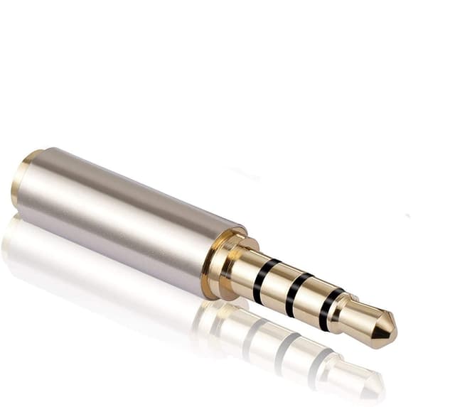 Audio-sovitin, joka muuntaa 3,5 mm stereoliittimen 2,5 mm:n stereoliittimeen. 3,5 mm naaras–2,5 mm uros.