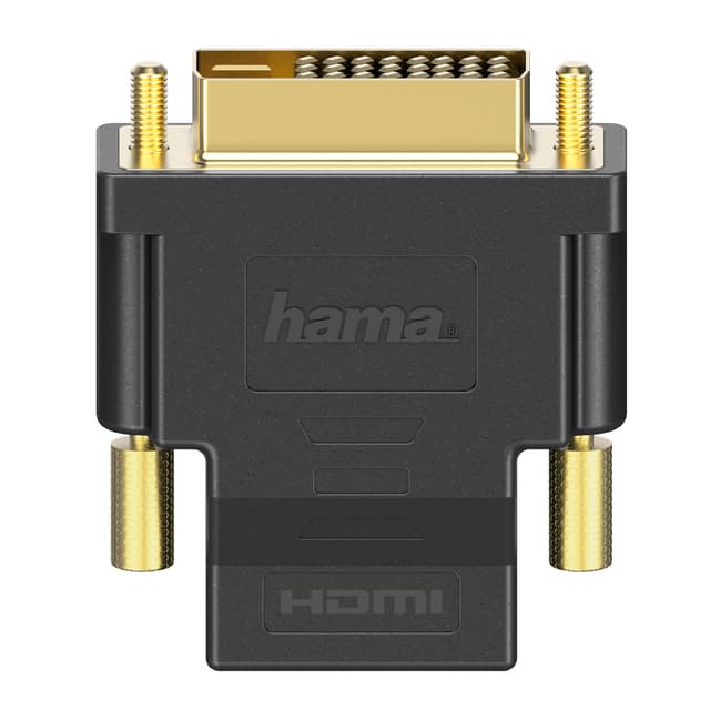 Sovita DVI-liitäntä HDMI-kaapeliin Hama DVI-HDMI -adapterin avulla. Adapterissa on kaksi ruuvia tukevaan kiinnitykseen. Kullatut liittimet vähentävät vastustusta ja tarjoavat näin parhaan mahdollisen signaalien siirron.