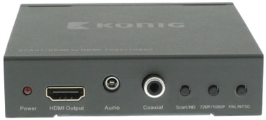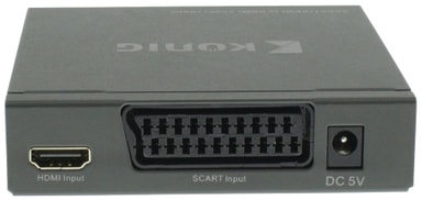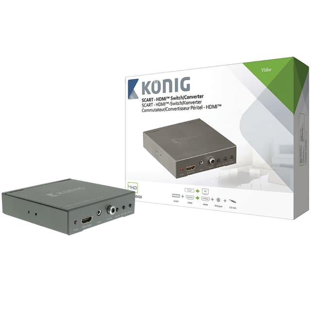 Muunna analoginen SCART-signaali digitaaliseksi HDMI-signaaliksi König-muuntimen avulla ja nauti analogisesta signaalista korkealla Full HD -resoluutiolla. Muunnin sopii DVD-soittimille ja muille ulkoisille laitteille, joiden lähettämä kuva halutaan muuntaa digitaaliseen muotoon. Muuntimessa on myös HDMI-tuloliitäntä, joten voit käyttää sitä monipuolisemmin.