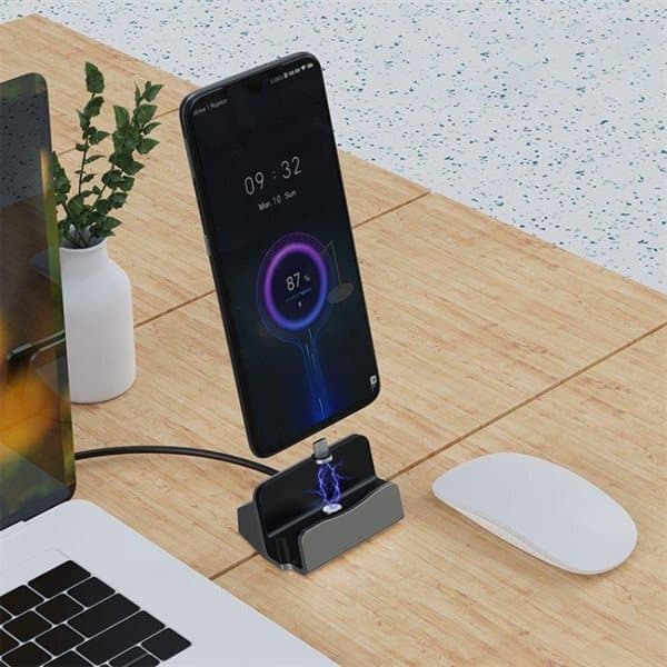 Kätevä latausteline, jolla voidaan ladata useimpia älypuhelimia, koska siinä on 3 liitintä, lightning, USB-C ja Micro-USB. Liittimet on helppo kiinnittää magneettikiinnittimellä. Magneetti helpottaa myös älypuhelimen lataamista, tarvitaan vain yhden käden toiminto.