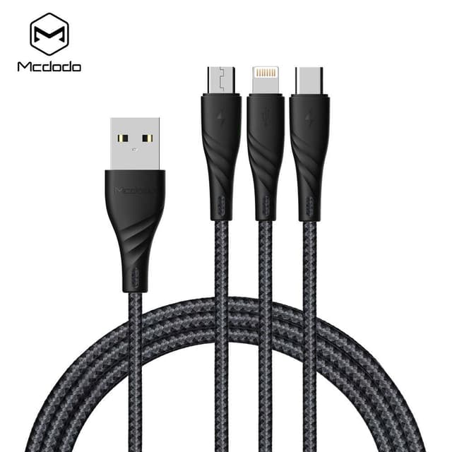 Kuvaus: Mcdodo CA-6451 on oivallinen kun sinulla tai perheelläsi on eri merkkisiä mobiililaitteita, koska sillä voit ladata kaikki laitteet vain yhdellä kaapelilla.USB C- ja Micro USB toimivat vain latauksessa. Lightning sekä synkronoi että lataa.