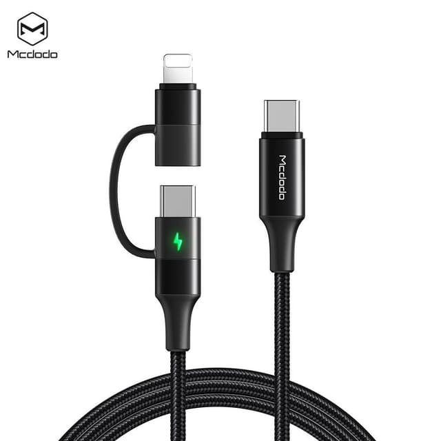 Mcdodo CA-7120 USB C–USB C + Apple Lightning (ei MFI) -kaapeli LED, synkronointi, nopea lataus, Android Apple, PD3.0, 60 W kangaspäällyste, 1,2 mTutustu ominaisuuksiin