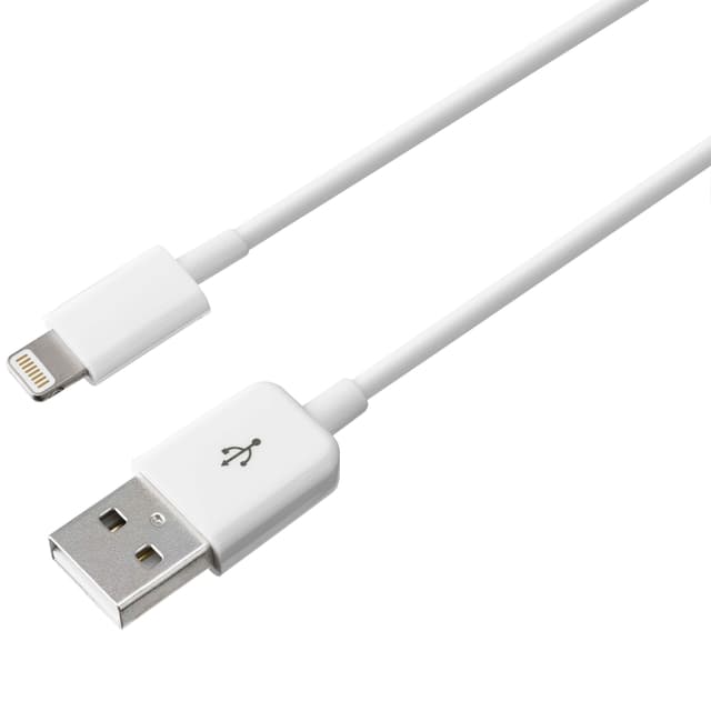 Valkoinen Sandstrøm-kaapeli, jossa USB- ja Lightning -liitännät. Sopii iPod-, iPhone- ja iPad -laitteille.Tutustu ominaisuuksiin