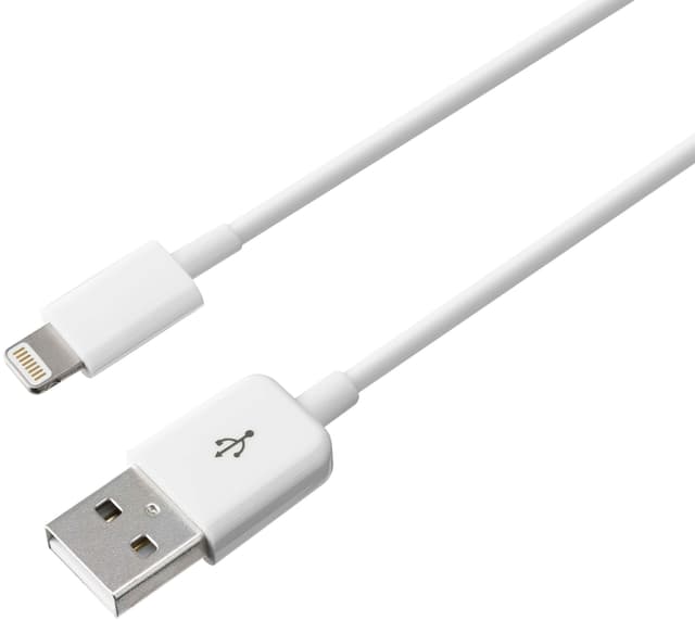 Valkoinen Sandstrøm-kaapeli, jossa USB- ja Lightning -liitännät. Sopii iPod-, iPhone- ja iPad -laitteille.Tutustu ominaisuuksiin
