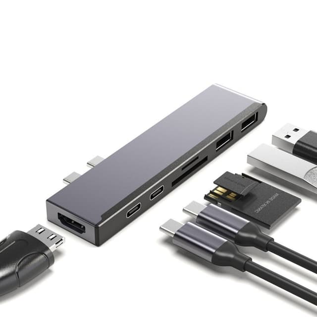 Moniporttinen sovitin lisäominaisuuksia varten: Tämä USB-C-keskitin tarjoaa tietokoneellesi useita liitäntävaihtoehtoja, kahdesta USB-C:stä 2 USB-A-, HDMI 4K-, TF- ja SD-muistikortille ja 2 USB-C-portille.