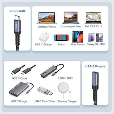 NÖRDIC 1m USB3.2 Gen2 USB-C jatkokaapeli uros-naaras 10Gbps 5A 100W Thunderbolt3Tutustu ominaisuuksiin
