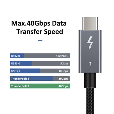 Tämä Thunderbolt 3 -kaapeli yhdistää kaikki Thunderbolt 3 -liitännän edut. Se mahdollistaa erilaisten laitteiden, kuten ulkoisten kaappien, näyttöjen, kortinlukijoiden ja telakointiasemien liittämisen PC:n tai kannettavan tietokoneen Thunderbolt 3 -portin kautta. Kaapeli tarjoaa tiedonsiirtonopeuden jopa 40 Gbps ja tukee USB-, DisplayPort-, PCI Express- ja Ethernet-tiedonsiirtoa. Yhden 5K tai kahden 4K DisplayPort -näytön liittäminen on mahdollista, samoin kuin USB 3.1 Gen 2 -laitteiden liittäminen. Lisäksi kaapeli mahdollistaa kytkettyjen laitteiden virransyötön jopa 100 W:iin asti.