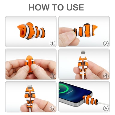 Yksinkertaisen käsittelyn ansiosta suojan kiinnittäminen on lasten leikkiä. Työnnä pohjassa olevaa pitkänomainen aukko kaapelin päälle, kunnes se peittyy.