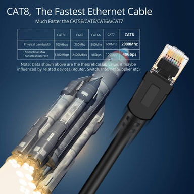 2000 MHz: Verkkokaapeli voi saavuttaa 2000 MHz: n kaistanleveyden, mikä on suuri parannus edellisiin malleihin verrattuna.