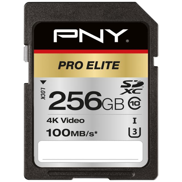 PNY Pro Elite SDXC -muistikortille tallennat ammattitason järjestelmä- tai videokameralla kuvatut nopeat valokuvasarjat ja 4K UHD -videot. Kortilla on 256 GB tallennustilaa, jatkuva U3-kirjoitusnopeusluokitus ja korkea luku- ja kirjoitusnopeus.
