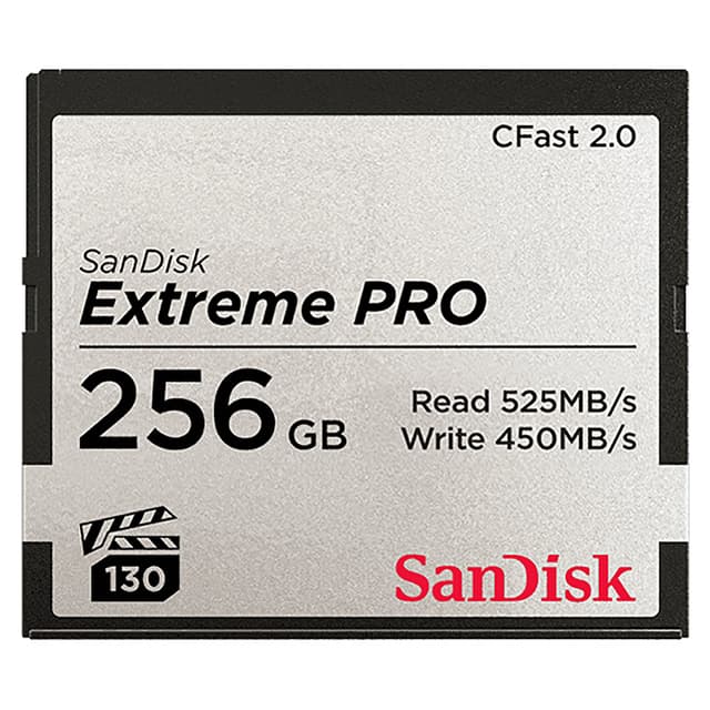 SanDisk Extreme Pro CFast 2.0 -muistikortilla on 256 GB tallennustilaa ja erittäin korkea, jopa 525 MB/s lukunopeus sekä 450 MB/s kirjoitusnopeus, minkä ansiosta se sopii RAW-tiedostojen tallennukseen ja ammattitason videokuvaukseen. Kortilla on myös Video Performance Guarantee (VPG) 130 -sertifikaatti, mikä mahdollistaa pakkaamattoman 4K-videon jatkuvan tallennuksen.