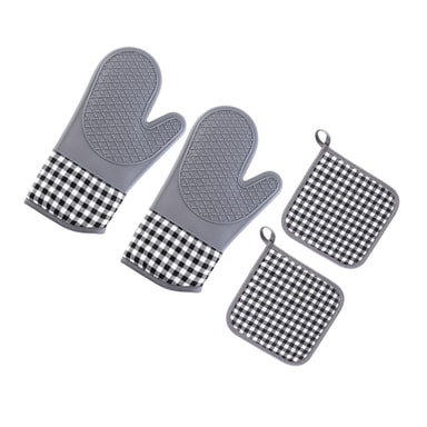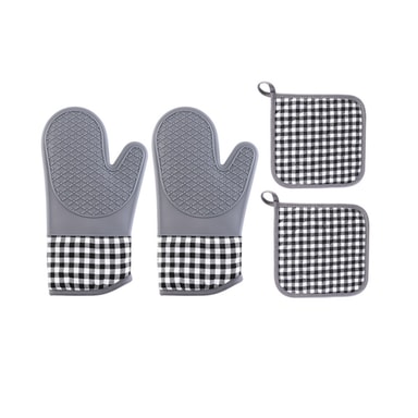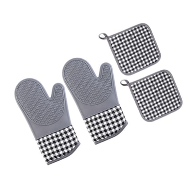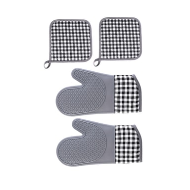 Monipuolinen keittiökäyttö: Tämä 4-osainen setti sisältää kaksi silikonista uunikinnasta ja kaksi puuvillaista pannunalusta, tarjoten täydellisen ratkaisun lämpösuojaukseen keittiössä. Käytä kinnaita kuumien keittoastioiden käsittelyyn, astioiden poistamiseen uunista tai ulkona grillaamiseen. Pannunalustat ovat ihanteellisia kuumien kattiloiden ja pannujen asettamiseen pöydille tai työtasoille, estäen lämpövauriot. Tämä setti on täydellinen monenlaisiin ruoanlaitto- ja leivontatehtäviin, mikä tekee siitä välttämättömän työkalun jokaiselle kotikokille tai ruoanlaittoharrastajalle. Nauti parannetusta turvallisuudesta ja käyttömukavuudesta tämän kattavan keittiösetin avulla.