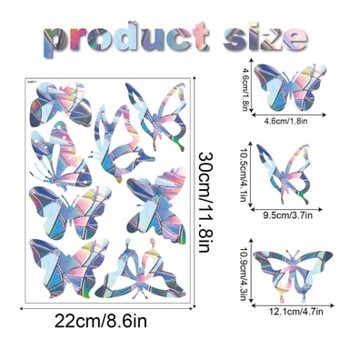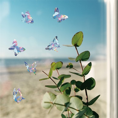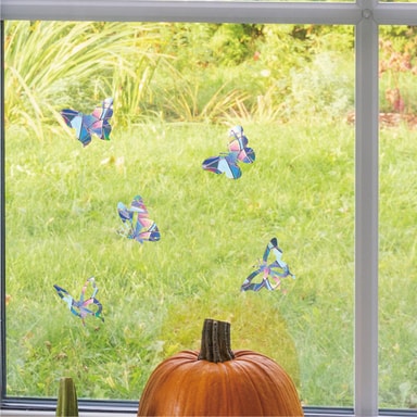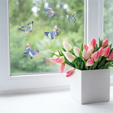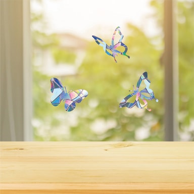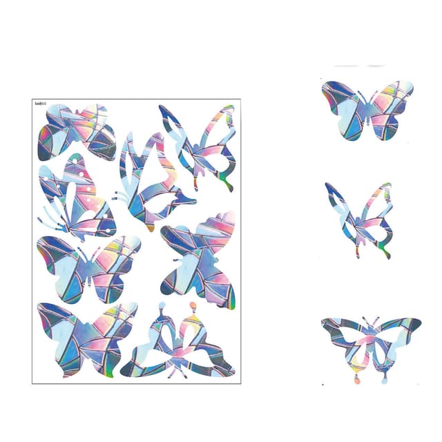 Nämä ikkunatarrat heijastavat auringonvaloa ja toimivat varoitusmerkkinä linnuille estäen niitä lentämästä ikkunoihin tai lasioviin. Näissä tarroissa on myös perhosaihe, mikä tekee niistä myös kauniin koristeen.