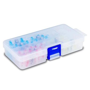 Kutisteletkusarja à 100 kpl erikokoisia - kotelo läpinäkyvillä juotosholkeilla integroidulla juottimella