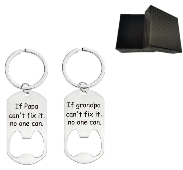 Perfekt femteval: Fäst på ringen är en tagg i rostfritt stål med ingraverad frasen ""Om pappa/farfar inte kan fixa det, kan ingen"", ett bevis på fäders/farfars påhittighet och expertis.