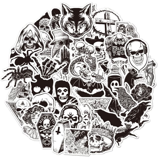 50 goottilaista tarraa, joissa on paljon erilaisia kuvioita. Nämä vedenpitävät tarrat voidaan kiinnittää mille tahansa sileälle pinnalle, ne ovat erittäin kestäviä ja ne voidaan helposti poistaa jättämättä jäämiä.