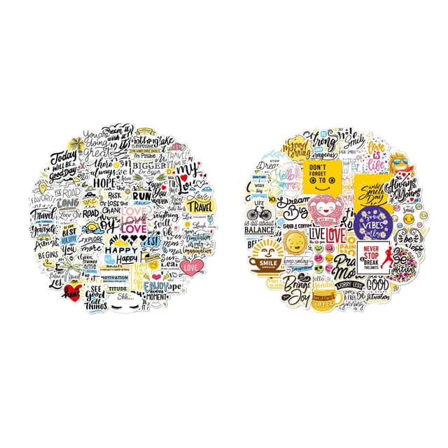 100 tarraa erilaisilla inspiroivilla sanoilla ja ilmaisuilla. Nämä vedenpitävät tarrat sopivat useimpien esineiden koristeluun, voit kiinnittää ne haluamaasi paikkaan.