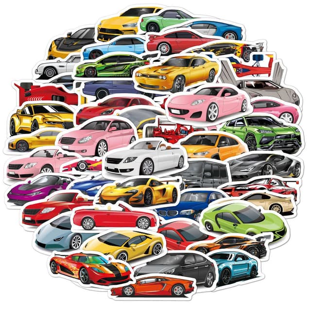 50 urheiluautotarraa eri malleissa ja väreissä. Nämä PVC-tarrat ovat kestäviä ja vedenkestäviä, ja ne voidaan kiinnittää erilaisiin esineisiin, kuten kannettavaan tietokoneeseen, laukkuun, polkupyörään, lumilautaan, autoon, kaappiin ja muihin.