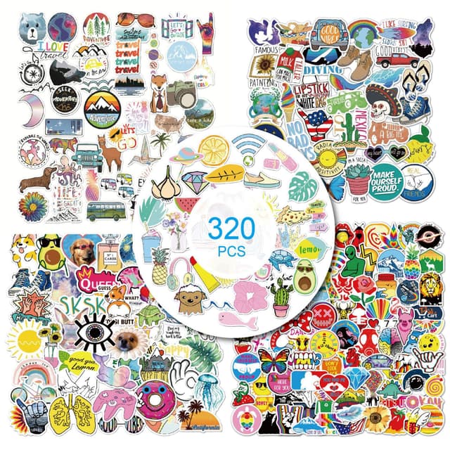 320 tarraa, joissa on paljon erilaisia aiheita - melkein ei kaksoiskappaleita! Nämä tarrat sopivat useimpien esineiden koristeluun. Ne ovat vedenkestäviä ja kestäviä, ja ne voidaan poistaa jättämättä jäämiä.