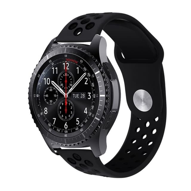 Vaikeasti tuuletettu urheilurannekoru nappilukolla. Tekniset tiedot Väri: musta Tämä tuote on yhteensopiva seuraavien kanssa: Samsung Gear S3 Frontier - S3 Classic Kiinnitys :: 22mm Säädettävä: 140 - 215 mm sisältö 1 x Sport silikonirannekoru 2 x nauhatulostus