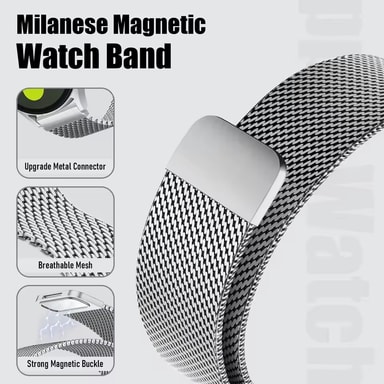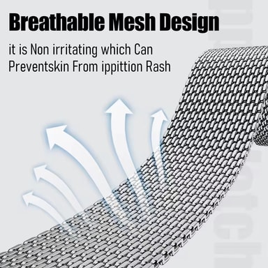 Säädettävä mukavuus: Milanese Loop -muotoilu mahdollistaa äärettömän säädettävyyden, mikä takaa täydellisen istuvuuden kaikenkokoisille ranteille. Magneettilukko kiinnittää rannekkeen turvallisesti estäen vahingossa tapahtuvan liukumisen ja mahdollistaen helpon säätämisen koko päivän ajan. Tiheästi kudottu verkkorakenne ei ole vain tyylikäs, vaan myös hengittävä, mikä vähentää hikeä ja ärsytystä jopa intensiivisen toiminnan aikana. Koe vertaansa vailla oleva mukavuus ja turvallinen istuvuus tällä huolellisesti valmistetulla kellon rannekkeella.