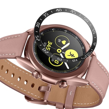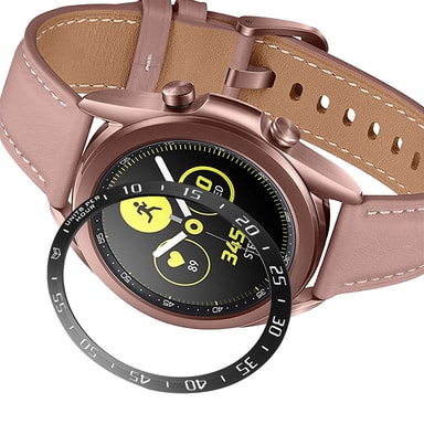 Parannettu kellon suojaus: Tämä ruostumattomasta teräksestä valmistettu kehysrengas tarjoaa vankan suojakerroksen päivittäistä kulumista vastaan ja suojaa Samsung Galaxy Watch 3:n näyttöä naarmuilta, kolhuilta ja vahingossa tapahtuvilta iskuilta. Sen tarkka suunnittelu varmistaa saumattoman istuvuuden säilyttäen kellon tyylikkään profiilin ja tarjoten samalla ratkaisevan tärkeän suojan. Kehysrenkaan korotetut reunat toimivat puskurina minimoiden suoran kosketuksen näytön ja mahdollisesti vahingollisten pintojen välillä, mikä pidentää arvokkaan älykellosi käyttöikää.