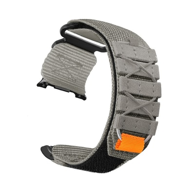 Harmaa nylonpunottu ranneke Samsung Watch 8/8 Classic -kelloille. Mukava, hengittävä ja säädettävä tarranauhalla. Täydellinen aktiiviseen elämäntyyliin ja päivittäiseen käyttöön.Tutustu ominaisuuksiin