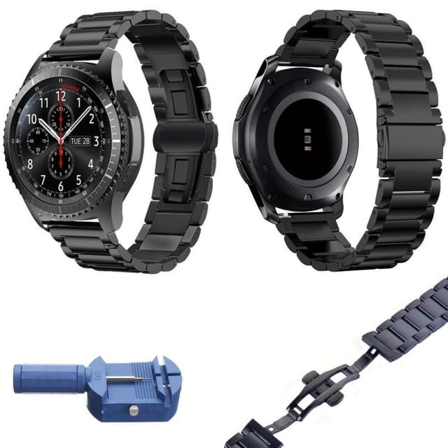 Rannekoru voidaan lyhentää mukana toimitetulla työkalulla. Huomaa, että tapit ovat kapenevia ja niitä voidaan puristaa vain yhteen suuntaan. Pikavapautus - lukko (poista molemmat painikkeet rannekorun poistamiseksi helposti). Tekniset tiedot Väri: musta Tämä tuote on yhteensopiva seuraavien kanssa: Samsung Gear S3 Frontier - S3 Classic Mallinumero: SM-R760 / SM-R770 Materiaali: 316L Liite: 22mm Säädettävä: 140–220 mm Pituus: 180mm Leveys: 22mm Paksuus: 3,5 mm sisältö 1 x ruostumattomasta teräksestä valmistettu rannekoru 2 x kaistalehti nopeasti kiinnitettävällä 1 x säätötyökalu