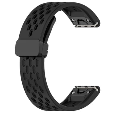 Turvallinen ja säädettävä istuvuus: Rannekkeessa on tukeva taittosalpa, joka pitää Garmin-kellosi tukevasti paikallaan koko päivän. Useiden säätöreikien avulla voit helposti mukauttaa istuvuuden ranteeseesi optimaalisen mukavuuden ja turvallisuuden takaamiseksi aktiviteetistasi riippumatta.