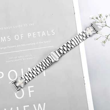 Tyylikäs apilanlehti design: Korosta älykelloasi tällä upealla apilanlehti-teemaisella ruostumattomasta teräksestä valmistetulla rannekkeella. Herkät apilanlehtiaksentit lisäävät ripauksen hienostuneisuutta ja viehätystä, mikä tekee siitä täydellisen asusteen kaikkiin tilaisuuksiin. Tämä ranneke yhdistää saumattomasti muodin ja toiminnallisuuden tarjoten ainutlaatuisen tavan personoida Fitbit Versa 3, Versa 4 tai Sense 2. Sen huomiota herättävä muotoilu herättää varmasti kohteliaisuuksia ja erottaa sinut muista. Erotu joukosta tällä kauniisti muotoillulla apilanlehtikuviolla, joka täydentää päivittäistä tyyliäsi.