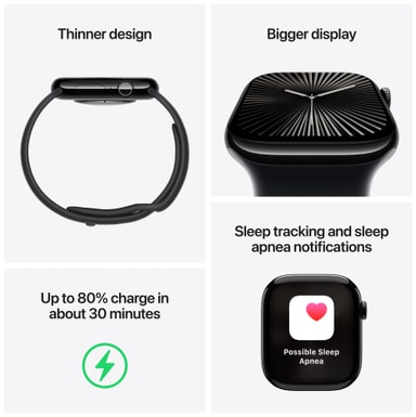 Apple Watch Series 10 tarjoaa suuremman näyttöpinta-alan ja on samalla ohuempi ja kirkkaampi kuin koskaan. Se tuo myös uusia mukautusvaihtoehtoja, kattavan terveyden seurannan ja ominaisuuksia, jotka on suunniteltu tukemaan elämäntyyliäsi.Tutustu ominaisuuksiin