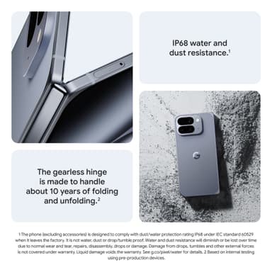 Google Pixel 10 Pro Fold 5G -älypuhelimessa on upea 6,4" OLED-näyttö, taitettava rakenne, 256 GB tallennustila, 16 GB RAM-muisti, edistyksellinen tekoäly, IP68-luokitus ja kestävä sarana, joka kestää taitot jopa 10 vuoden ajan.Tutustu ominaisuuksiin